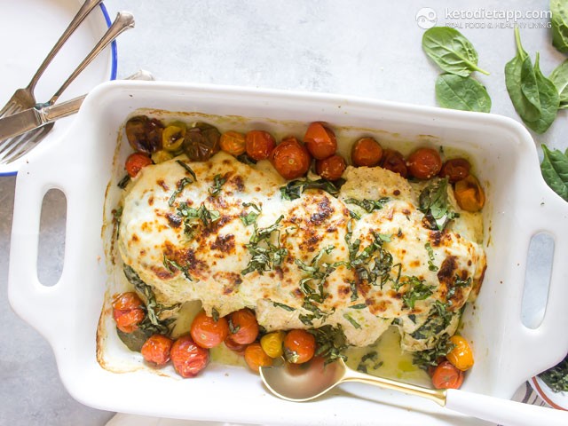 Low-Carb Pesto Caprese Chicken Casserole | The KetoDiet Blog–This low-carb & keto friendly casserole is made with delicious layers of tender chicken, cheesy mozzarella and parmesan, tangy pesto, spinach, and roasted cherry tomatoes! KetoDietApp