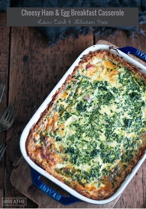 Ham & Cheese Low Carb Breakfast Casserole – Gluten Free–This delicious low carb breakfast casserole (or quiche) is flavored with ham, cheese, and healthy spinach, and it has a crunchy gluten free crust! I Breathe I'm Hungry