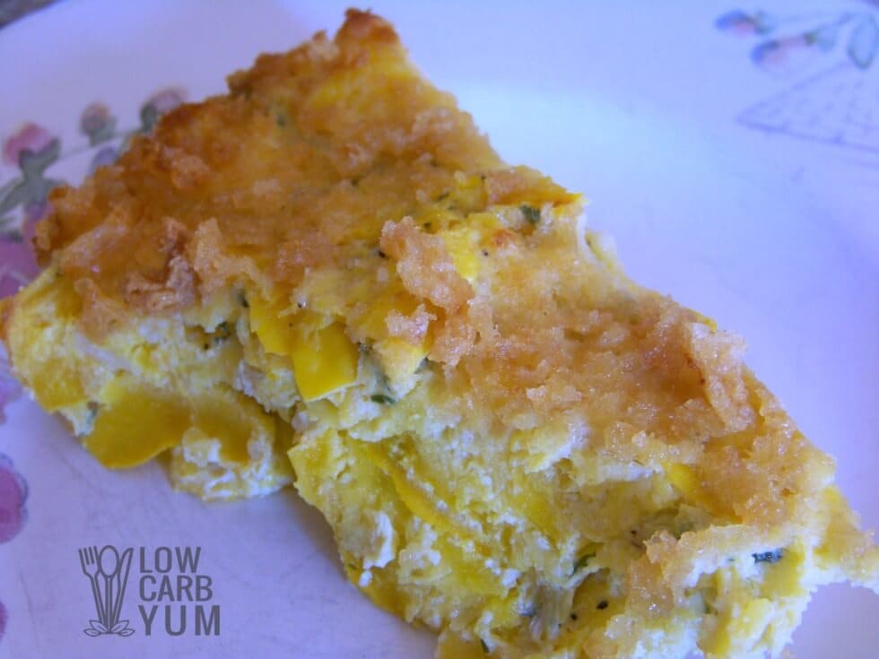 Easy Yellow Squash Casserole Recipe–This easy low carb yellow squash casserole recipe is made without cheese. It's topped with a mix of butter and pork rinds with eggs holding it together. Low Carb Yum