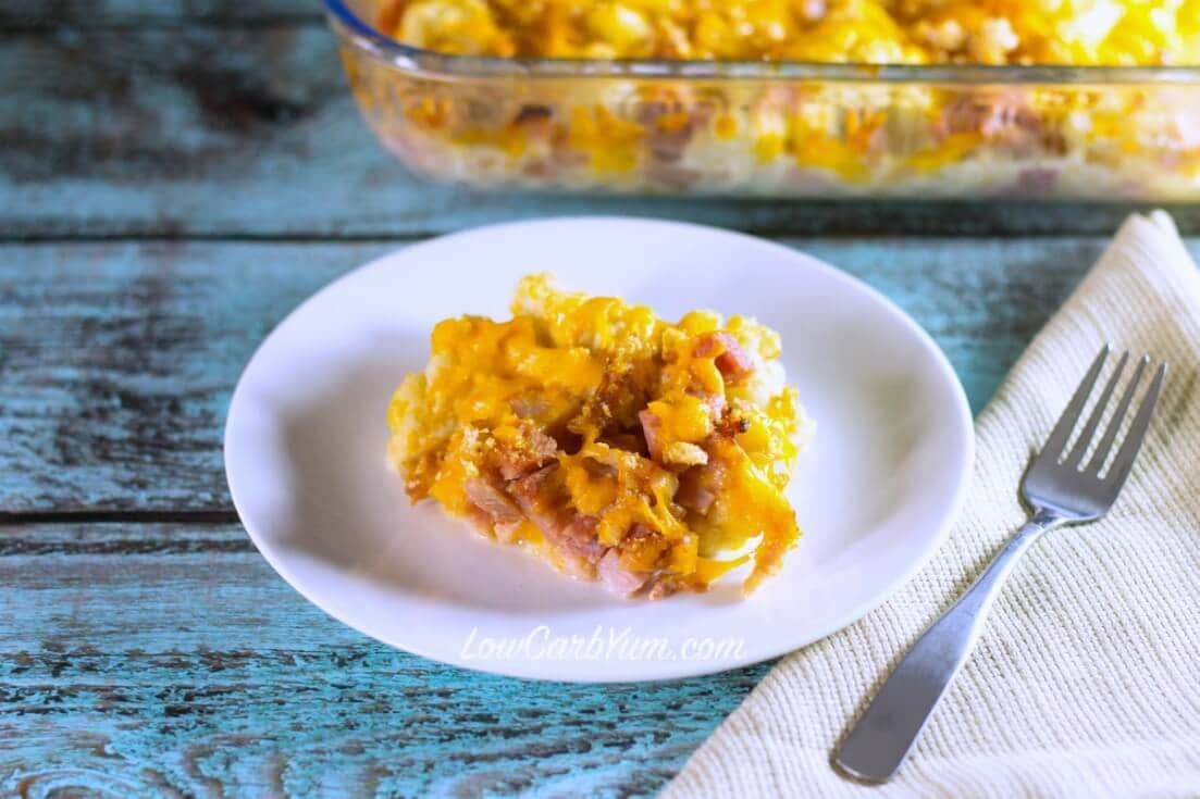 Cheesy Low Carb Cauliflower Casserole with Ham–A delicious cheesy low carb cauliflower casserole that's super easy to prepare. And, it's the perfect way to repurpose leftover ham. Low Carb Yum