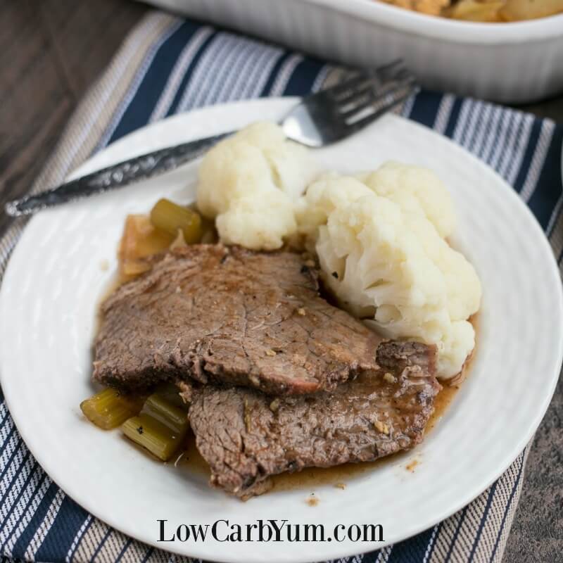Low Carb Crock Pot Roast Beef Recipe–A simple low carb crock pot roast beef that slow cooks during the day. Serve it with steamed or mashed cauliflower for a comforting meal. Low Carb Yum