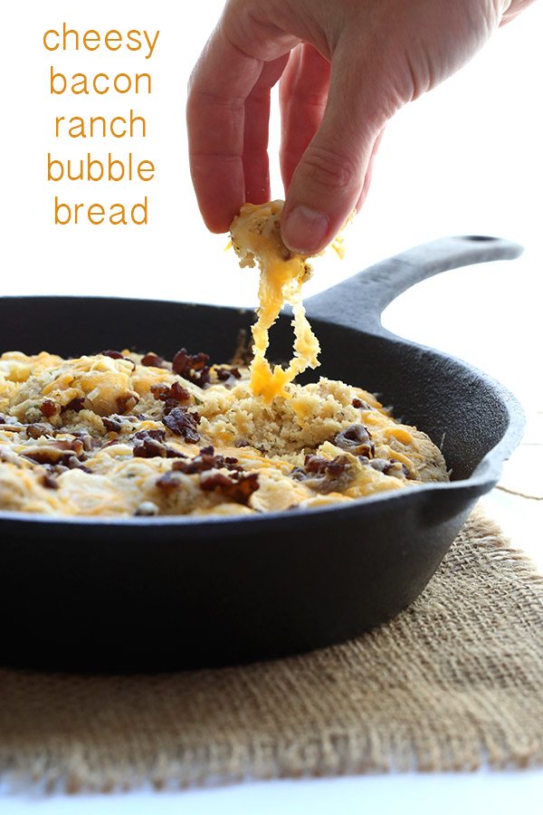 Cheesy Bacon Ranch Bubble Bread–Delicious low carb biscuits made with bacon fat and baked in a skillet. These cheesy ranch biscuits are a crowd pleaser! If you're like me, you religiously save all the bacon grease from every single time you fry bacon. You know it's good stuff, you know it's healthy and you can't bear to see it wasted. Especially the uncured variety, all that wonderful smoked pork fat that ends up in the bottom of your pan. All Day I Dream About Food