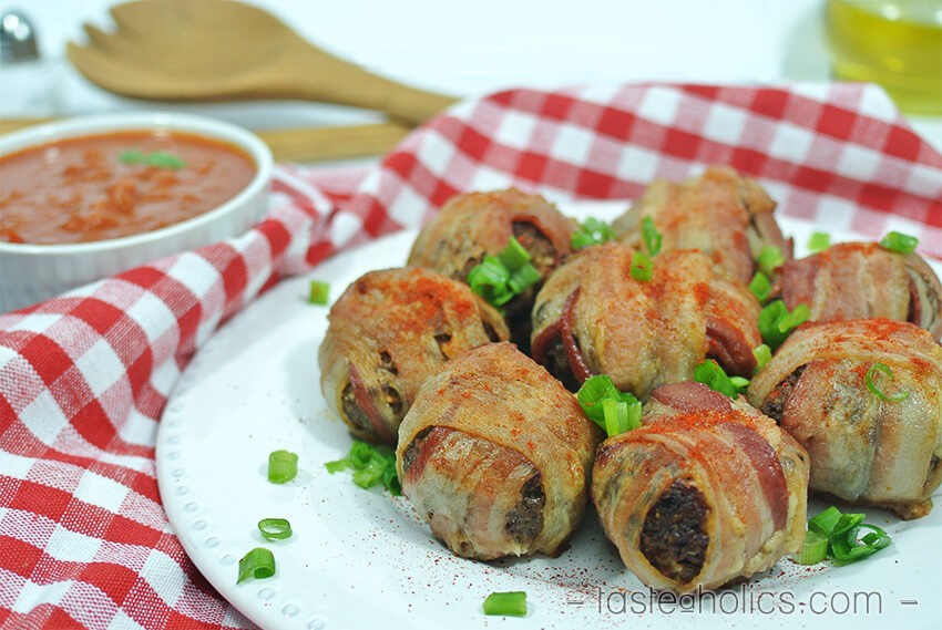 Cheesy Pesto Stuffed Meatballs in Bacon–In Honor of National Bacon Day…We present our loaded, stuffed meatballs wrapped in bacon!This recipe was just waiting to happen. Mozzarella and meatballs dipped in marinara sauce sounds heavenly and has been done time and time again. But add in some pesto and you've got a completely different flavor- something more earthy and herby. Tasteaholics