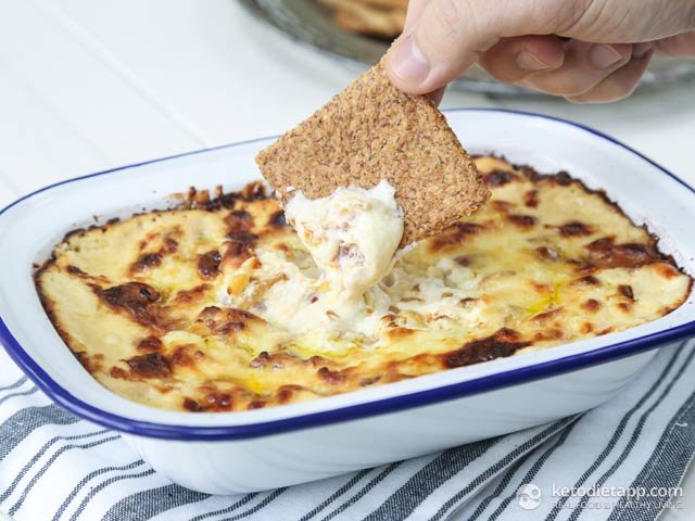 Low-Carb Cheesy Bacon Dip | The KetoDiet App–If you make my crispy keto crackers, you have to try them with this quick and easy cheese & bacon dip! I made mine with cheddar, caramelized onion, chili pepper and crisped-up bacon. Caramelised onion brings a sweet umami, while chili pepper adds extra heat and takes the traditional cheese dip to the next level. KetoDiet App