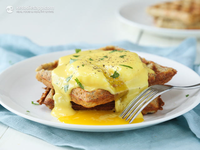 Cheesy Keto Waffles | The KetoDiet App–These waffles are so versatile! I use them as a side with pulled pork, soups, and all sorts of salads. They also make a fantastic alternative to English muffins in Eggs Benedict. KetoDiet App