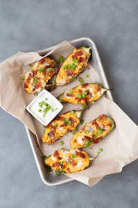 Buffalo Chicken Jalapeno Poppers–Two traditional bar appetizers just got a major makeover with this recipe. How about instead of choosing between jalapeno poppers or buffalo chicken wings, you just get both in one dish with the Buffalo Chicken Jalapeno Poppers? Peace Love and Low Carb