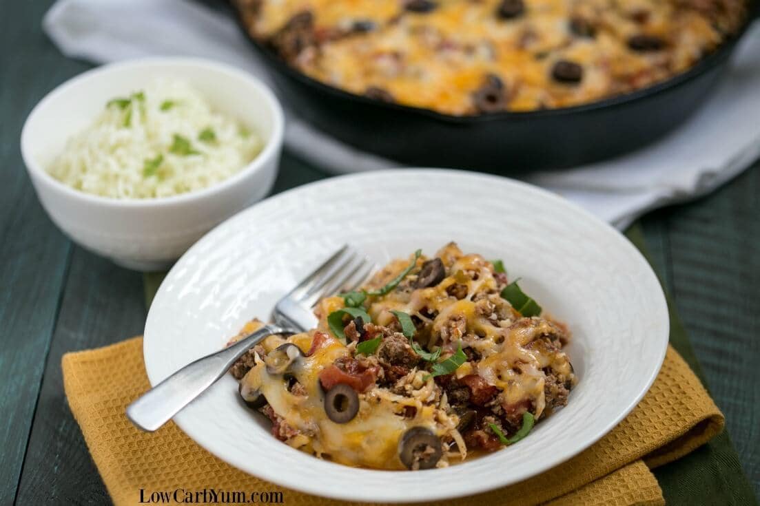 Cheesy Beef Taco Skillet Recipe with Cauliflower Rice–Enjoy this cheesy beef taco skillet recipe which doesn't require any high carb tortillas. It's an easy one pan low carb dish that cooks up quickly. Low Carb Yum