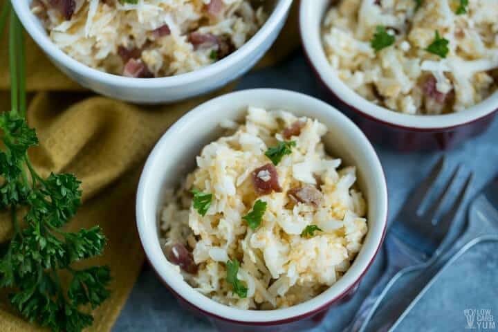 Cheesy Cauliflower Rice – Quick Keto Meal–Only five simple ingredients and less than ten minutes are needed to whip up a delicious cheesy cauliflower rice. It makes a perfect keto meal. Low Carb Yum