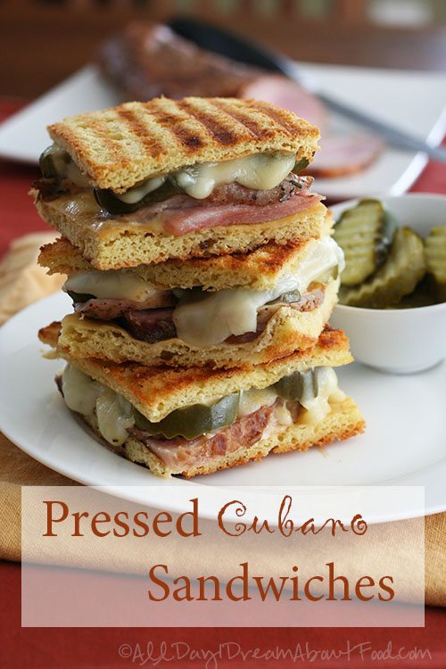 Pressed Cubano Sandwiches – Low Carb and Gluten-Free–Smoked ham and pork tenderloin together on low carb, gluten-free sandwich bread. This post is sponsored by Smithfield. My husband is a sandwich guy sandwiches are and always have been his go-to food. Back when I first met him, he used to eat 3 sandwiches for lunch every day. Mind you, this was when he was in his 20s, his metabolism was revved up and his job as an archaeologist kept him physically active all day long. Still, that floors me. 3 whole sandwiches. Even at my metabolic peak, I could hardly make it through one whole sandwich. All Day I Dream About Food