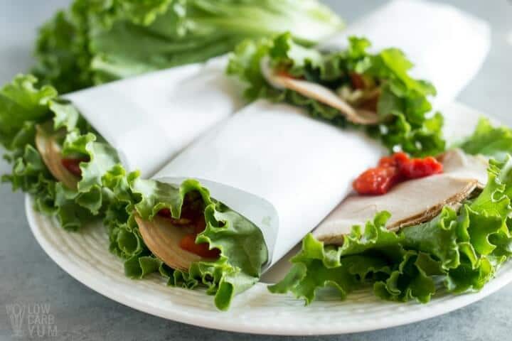 Low Carb Lettuce Wraps with Turkey & Roasted Peppers–Quick and easy low carb lettuce wraps make a perfect keto lunch on the go. Just wrap deli meat, cheese, and veggies in a large lettuce leaf. Low Carb Yum