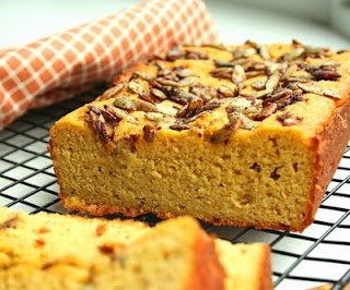 Pumpkin Cardamom Bread with Cinnamon Pepitas (Low Carb and Gluten Free)–Apparently, I have been downgraded. Yes, my friends, sad but true. I did not spend enough money at Starbucks over the past year to remain in the Gold Level, so I have been downgraded to the lowly Green Level. I blame my children. See, my children adore Starbucks, and it's gotten to the point where if I pull into the parking lot, my almost-2-year-old starts clapping her hands and saying ‘YAY!'. Which means that if I go to Starbucks, I have to buy them all something. All Day I Dream About Food