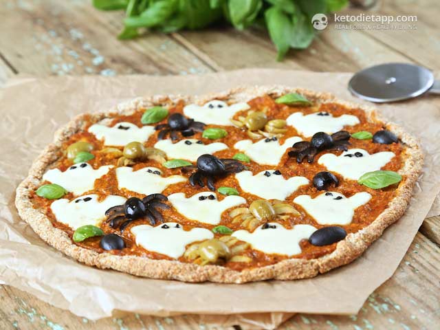 Halloween Keto Pizza | The KetoDiet Blog–I've been thinking about what to make for Halloween this year. A couple of years ago I made sweet keto Halloween Cookies so I thought it's time for a savoury recipe. KetoDietApp