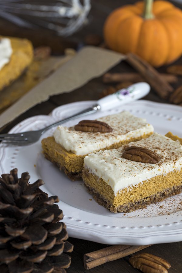 Pumpkin Cheesecake Bars–Pumpkin Season is here, once again! It's Fall again but you won't feel it if you step outside in NY. Instead of the usual crisp air and crunchy leaves, we're experiencing temperatures in the high 80's! Tasteaholics