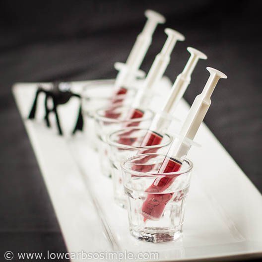 Spider Blood Shot (Halloween)–Can you imagine, Halloween is already day after tomorrow! Now it’s a good time to think of last-minute preparations. If you are still unsure what drinks to serve, this “Spider Blood Shot” is a great option. This iced tea creation is bloody tasty and easy to make! Again, the presentation is everything, so make sure to get enough syringes and schnapps glasses for serving. Low-Carb, So Simple!